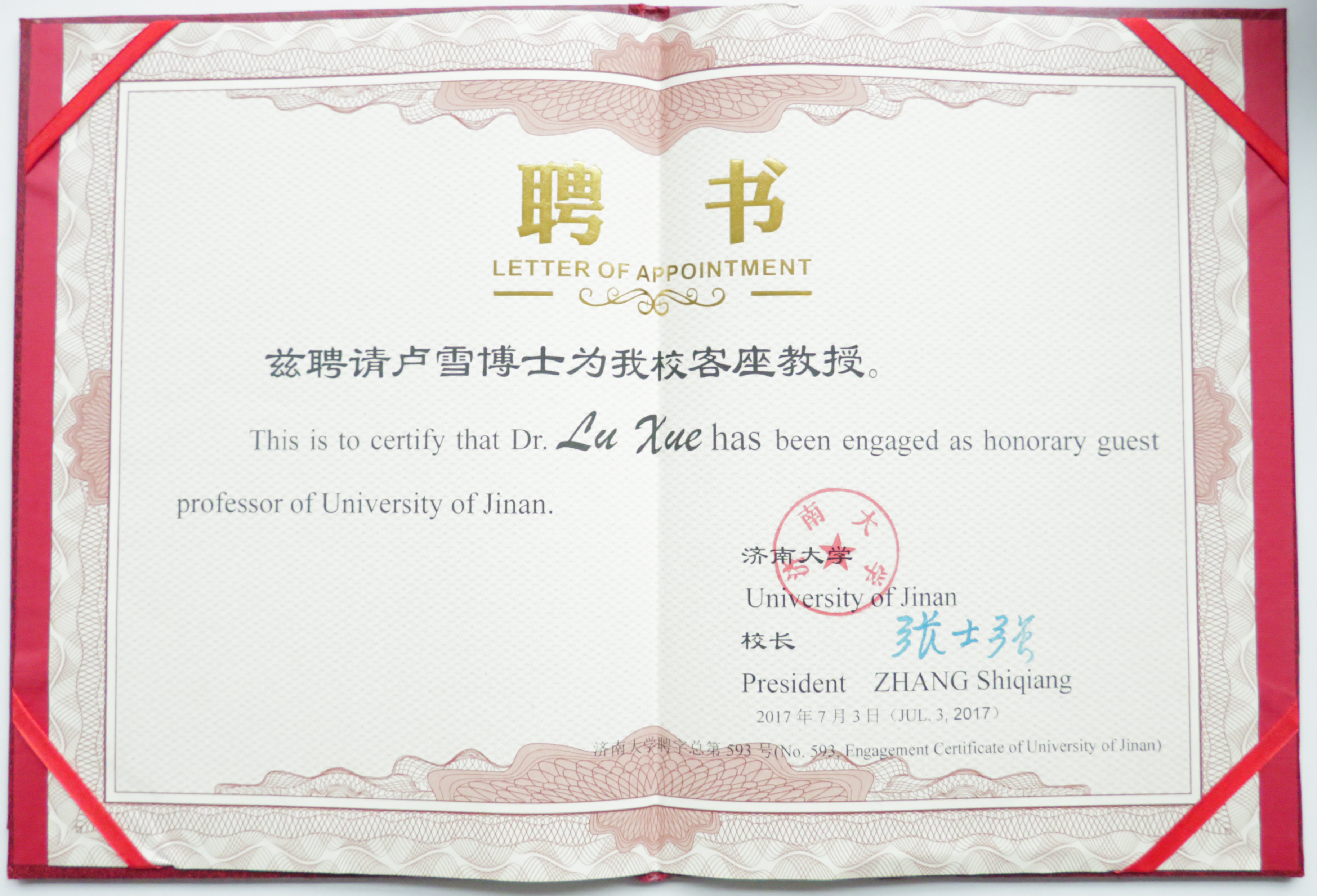 2017年被济南大学聘请为客座教授